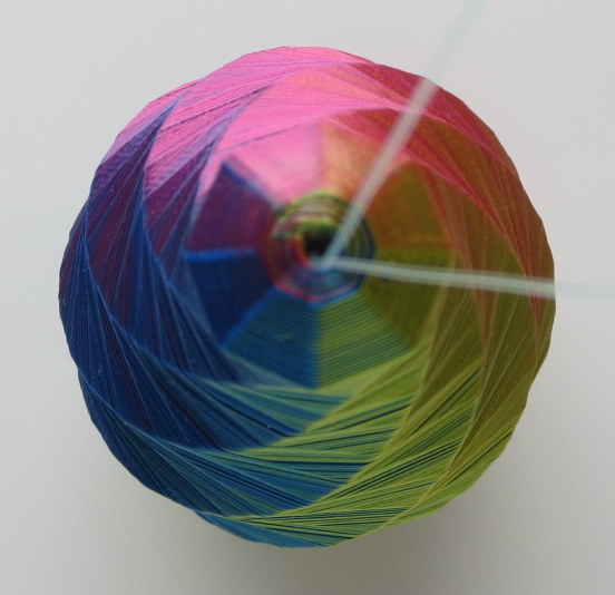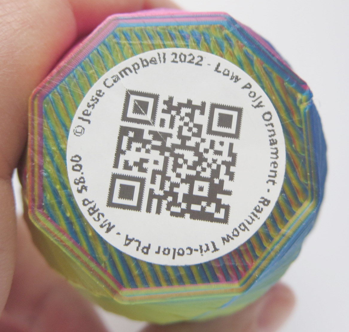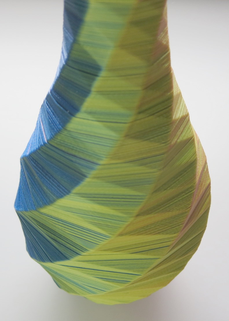This ornament is made from Tri-color red/blue/yellow PLA plastic. The model is a low-poly (low-polygon) vase, modified to hold a string in the center. Designed using the free open-source program, OpenSCAD. Created on a 3d-printer in about 3 hours.